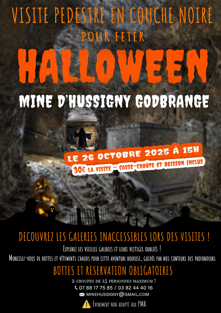 ?ïž Le dimanche 26 octobre 2025 Ă 15h, venez vivre une expĂ©rience unique : une visite pĂ©destre en couche noire, Ă la lampe Ă carbure, dans les galeries anciennes de la mine dâHussigny-Godbrange.